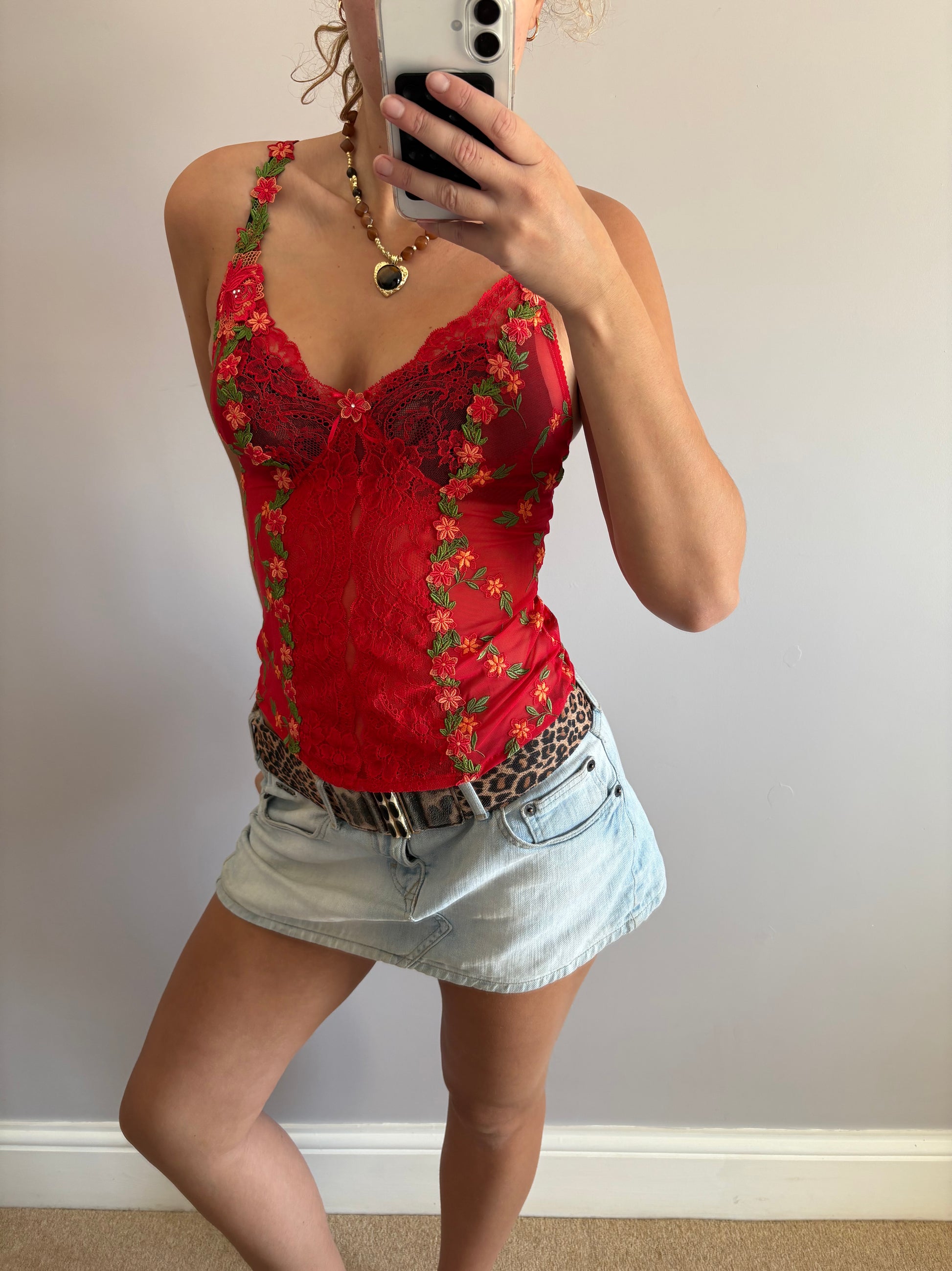 red flower laced unique cami top